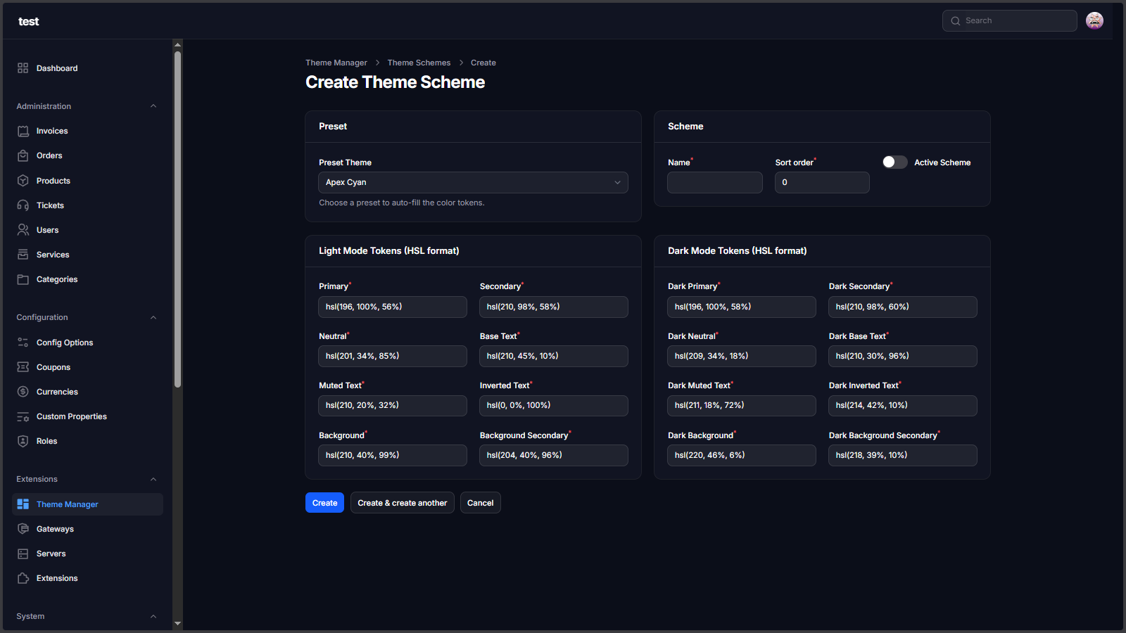 - Color scheme manager with presets and manual HSL tokens