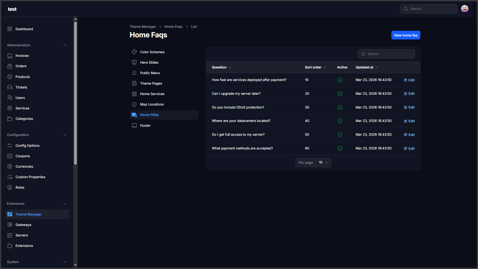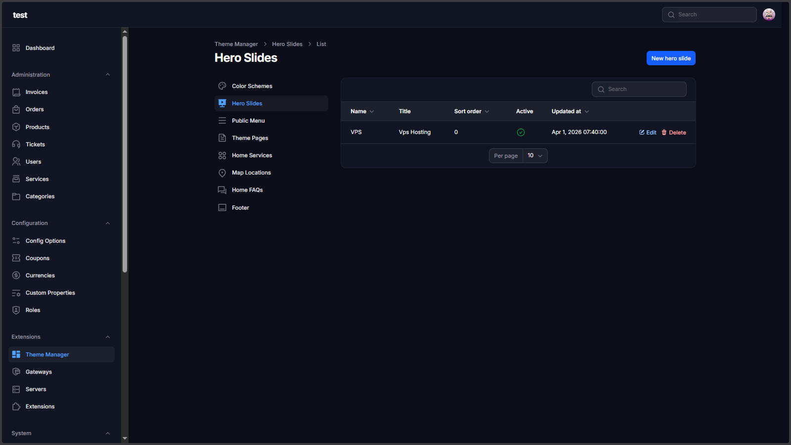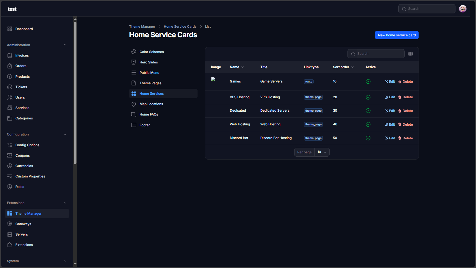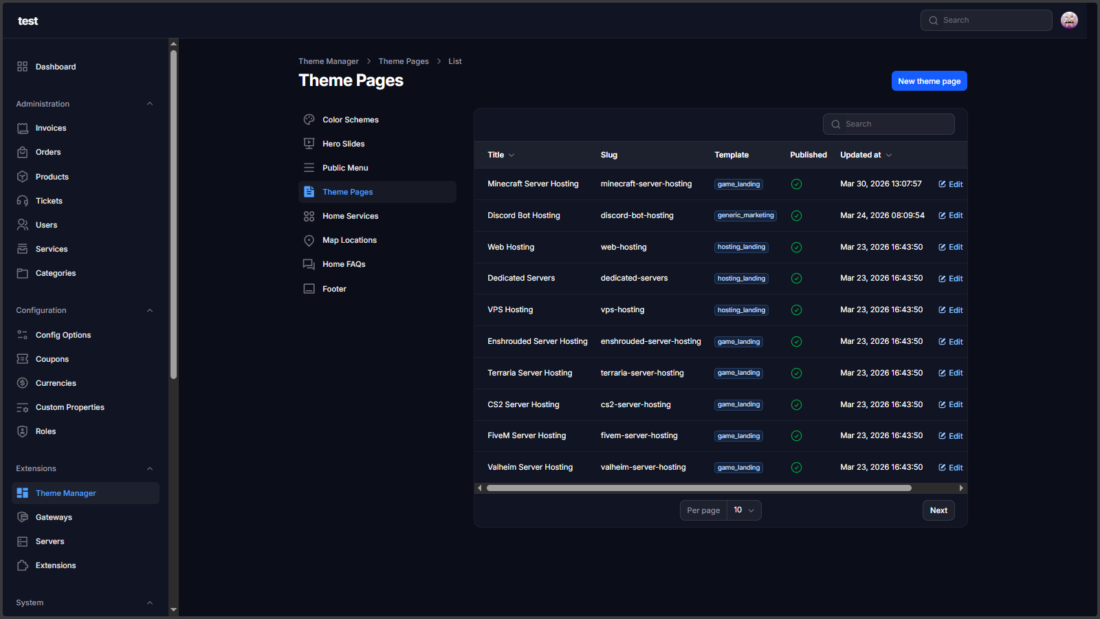 Theme Manager Extension is a complete storefront control layer for Paymenter. It lets you manage hero sliders, public navigation, footer blocks, homepage sections, color schemes, and custom landing pages from admin without editing Blade files for every content update.