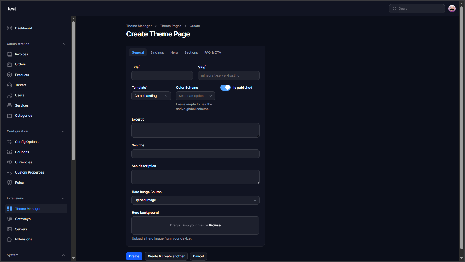 - Theme Page builder with game_landing, hosting_landing, and generic_marketing