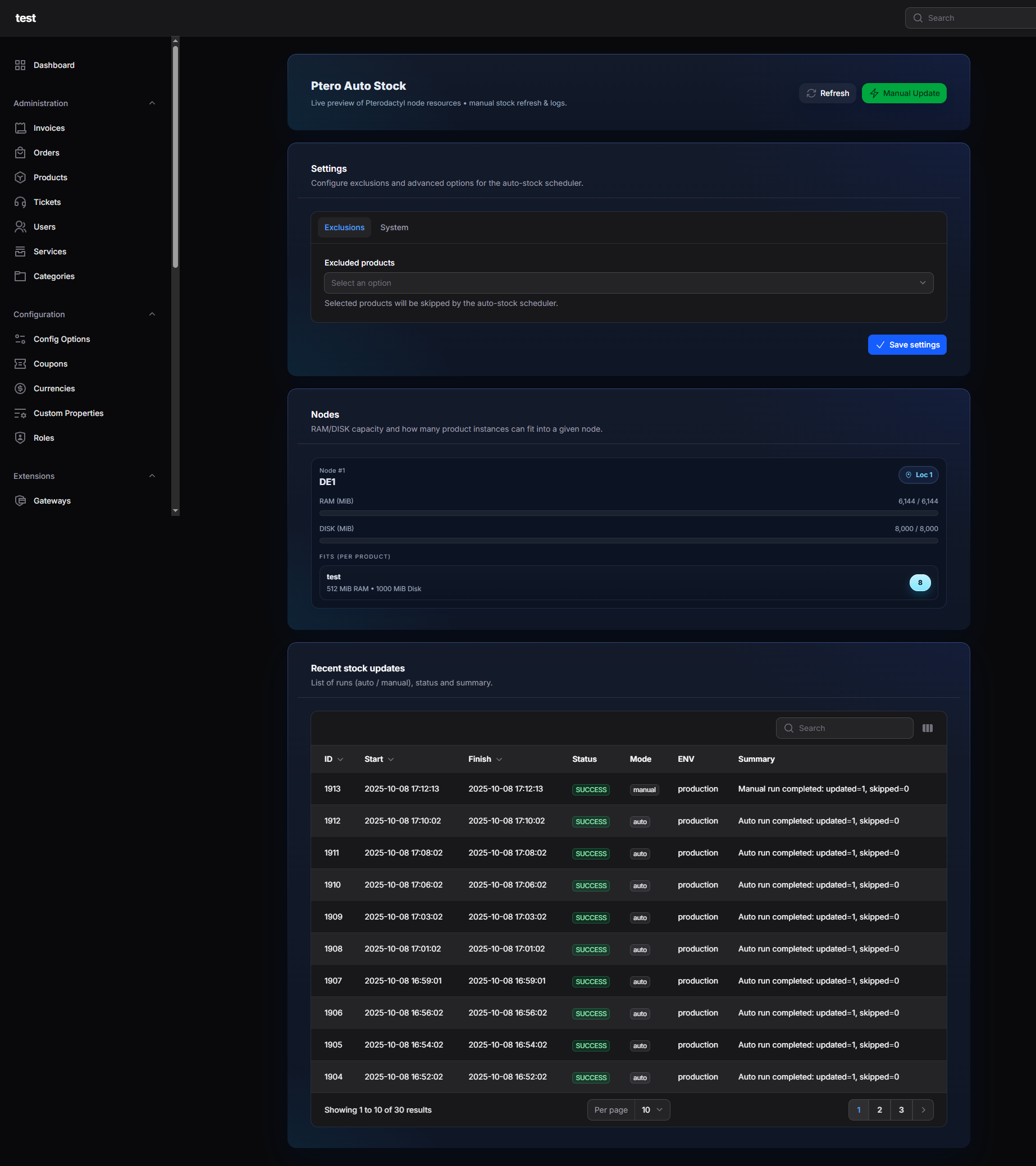- Enable it in Paymenter Admin → Extensions → Others → PteroAutoStock → Enable.