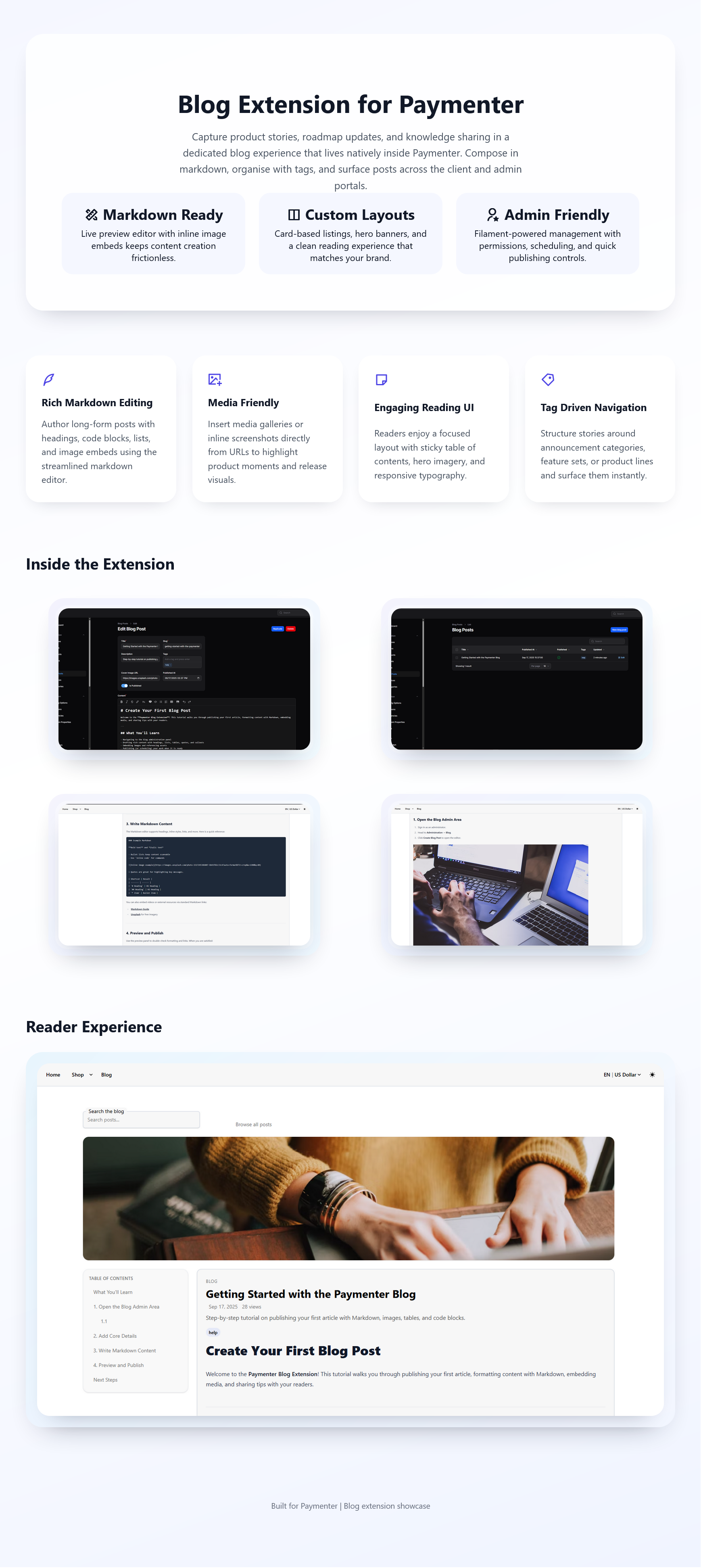 product stories, roadmap updates, release notes, and knowledge sharing directly inside Paymenter with a seamless, markdown-powered blog.
