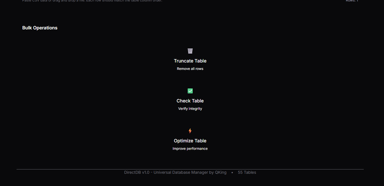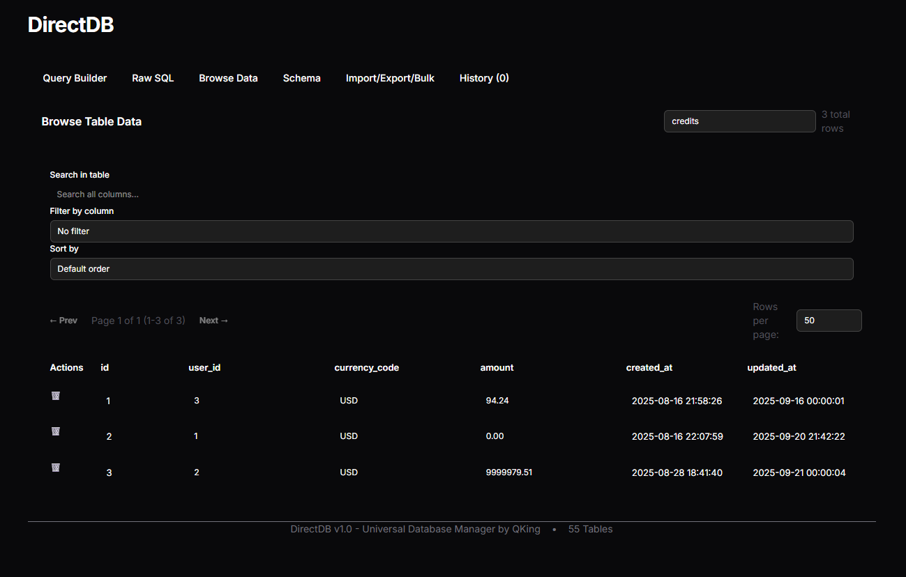 - <b>Browse Data</b> — Interactive table viewer with filters, search, sorting, pagination, and inline editing.