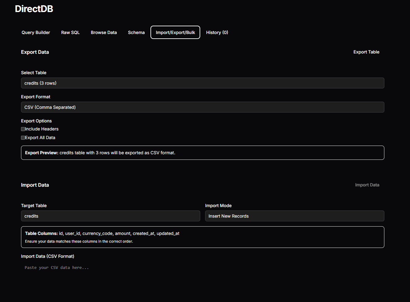 With DirectDB, you can construct queries visually, execute raw SQL with syntax highlighting, browse data with filters, explore table structures, import/export data across formats, and review full query history.