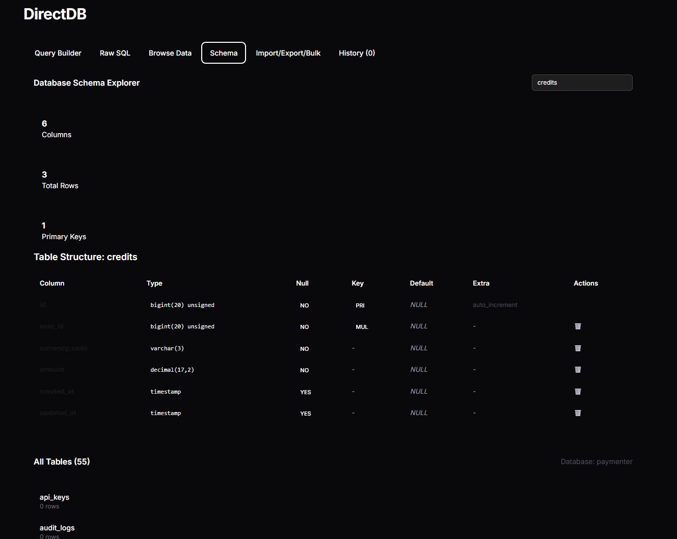 - <b>Schema</b> — Complete database structure explorer with column types, keys, defaults, and row counts.