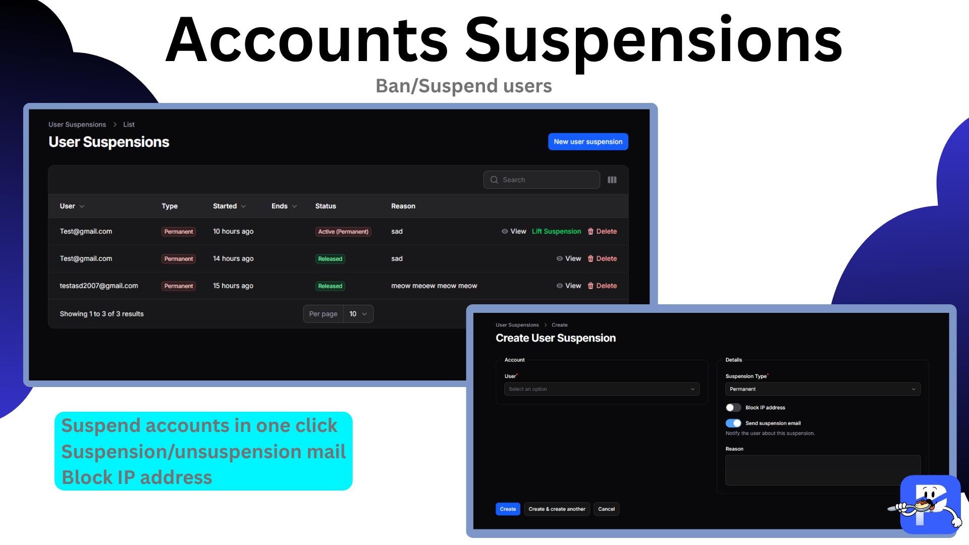 - <b>Dynamic suspensions</b> – temporary or permanent account bans with automated logout, optional IP blocking, and audit history.