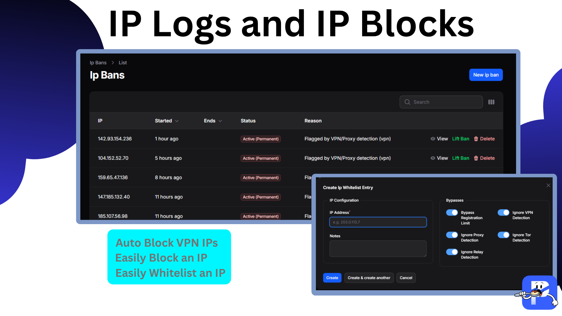 - <b>Admin tooling</b> – dedicated Filament pages for suspensions, IP bans, account/IP whitelists, and historical IP log review.