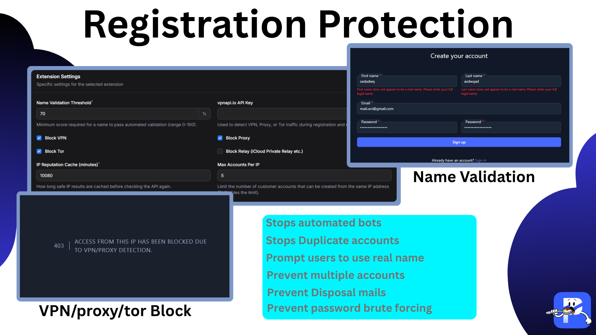- <b>Name & IP validation</b> – blocks registrations with gibberish names, disposable or repeated IPs, and optionally VPN/Proxy/Tor networks via vpnapi.io.