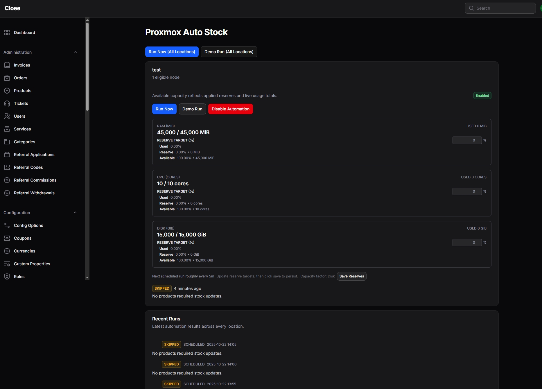 Automatically adjusts product stock based on the actual free resources (RAM, CPU, Disk) available across your Proxmox locations. No more overselling or manual stock updates — customers only see plans that can really be deployed.